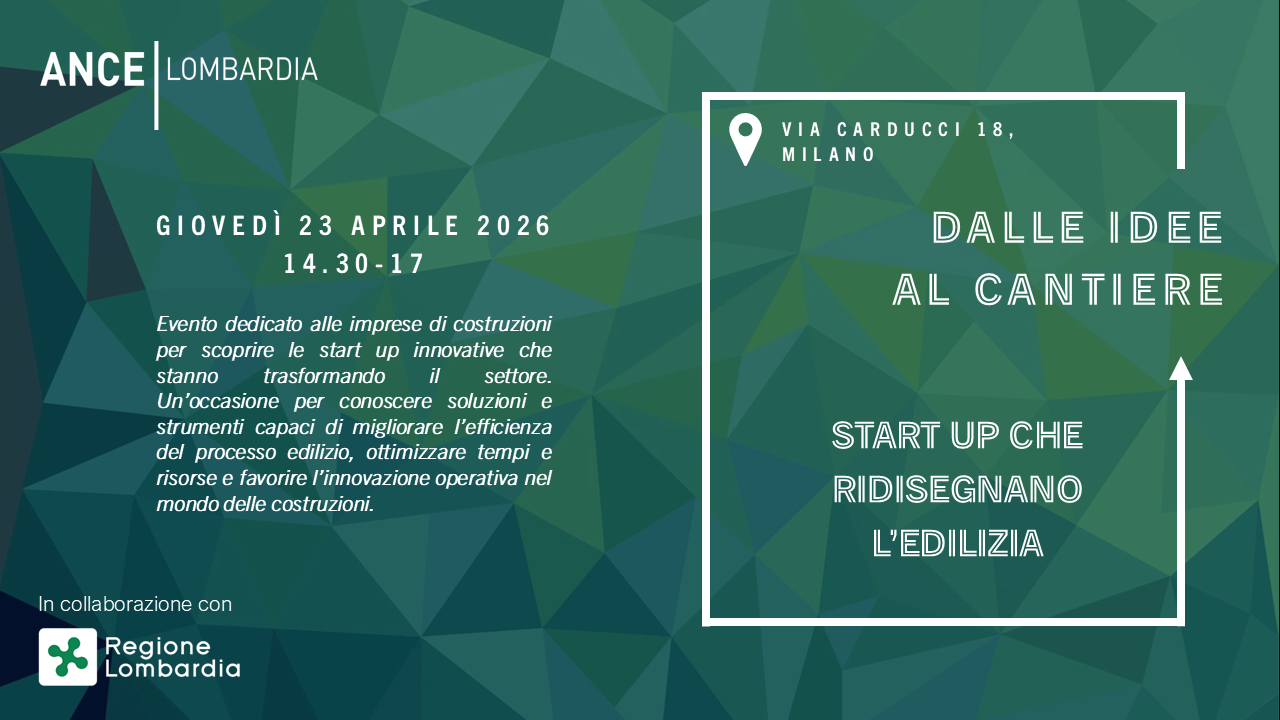 Il prossimo giovedì 23 aprile, alle ore 14.30, si terrà l’evento “Dalle idee al cantiere: Start up che ridisegnano l’edilizia”, organizzato da ANCE Lombardia in collaborazione con Regione Lombardia, Direzione Generale Sviluppo economico.